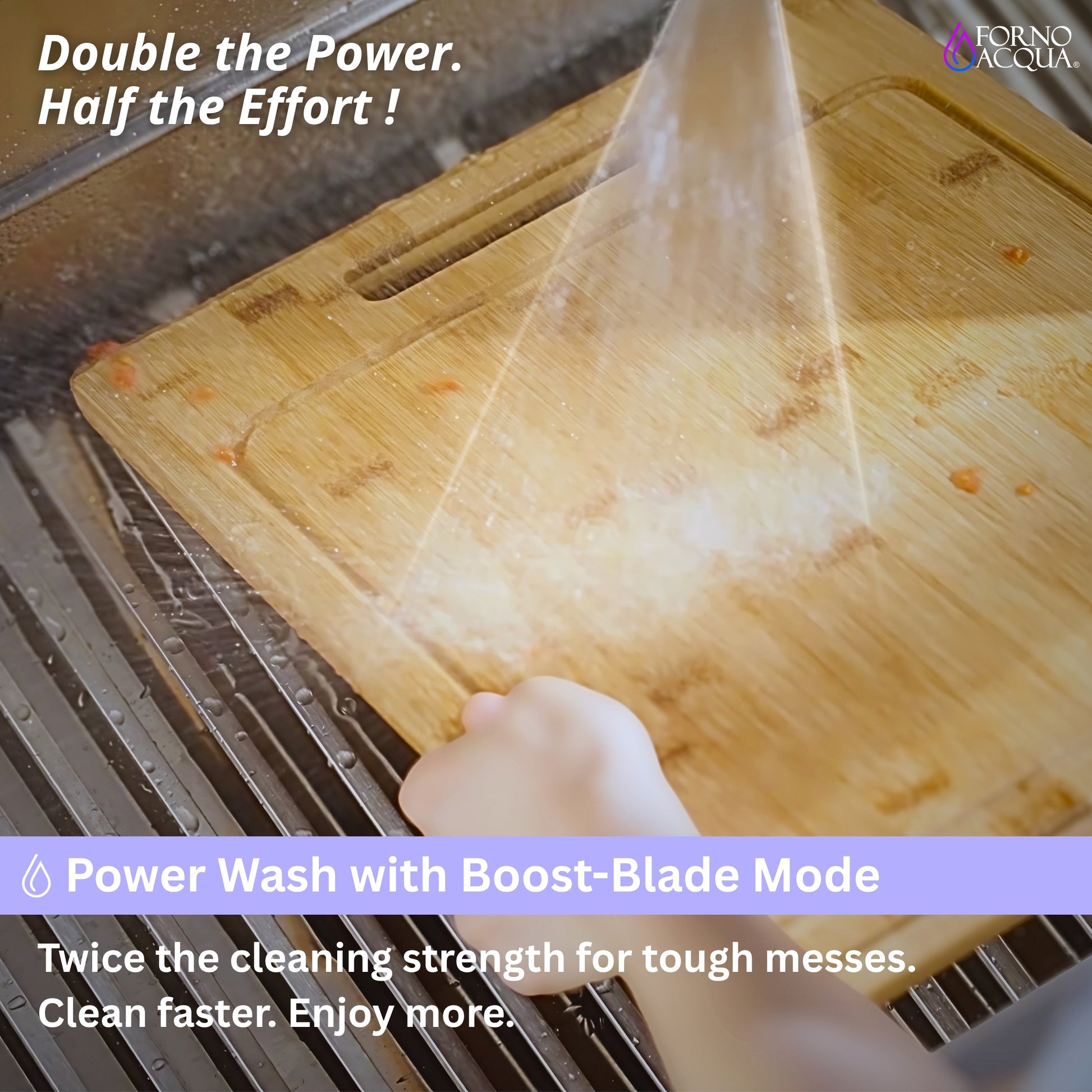* 4-Function Stainless Steel Pull Down Pivoting Waterfall Chef Faucet combines wide Waterfall Rinse with Boost Blade Power Wash