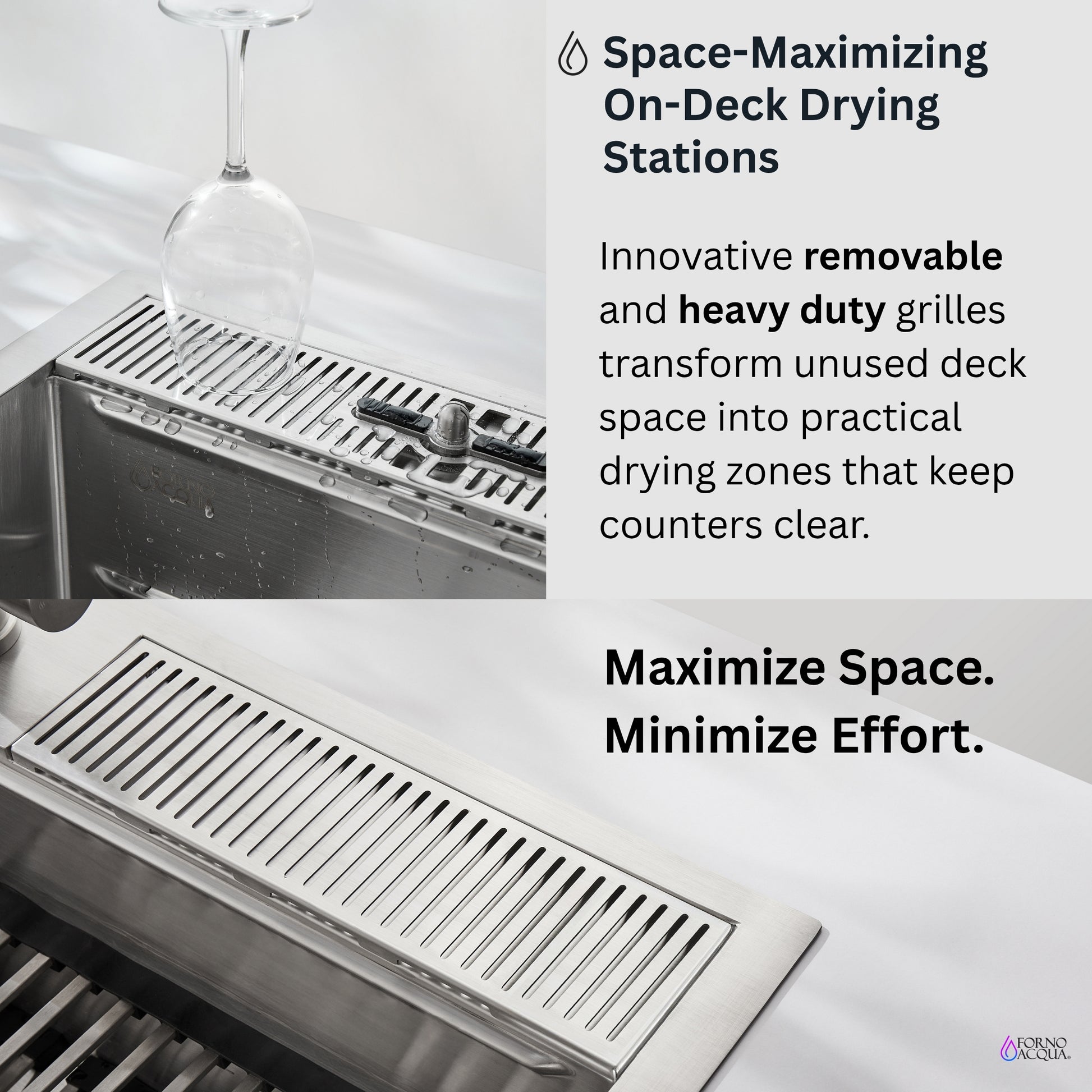 * Innovative On-Deck Drying Stations Turn Sink Deck into Space-Maximizing Dry Zones that Keep Counters Clear