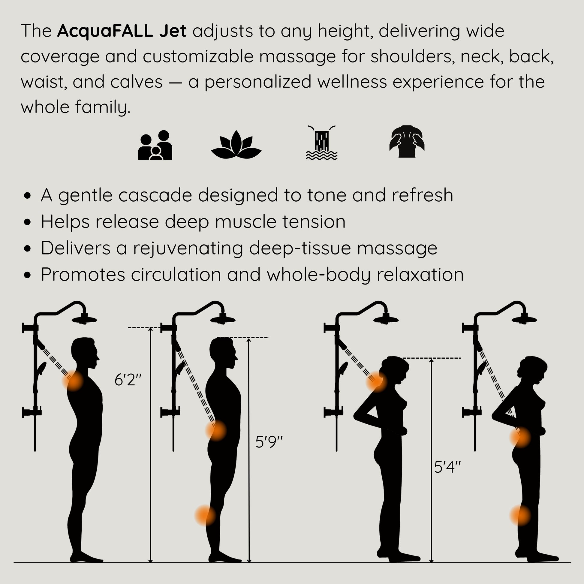 * Wide-Angle Directional Body Jet for All Heights and body parts: The AcquaFALL Body Jet pivots easily to accommodate users of different heights